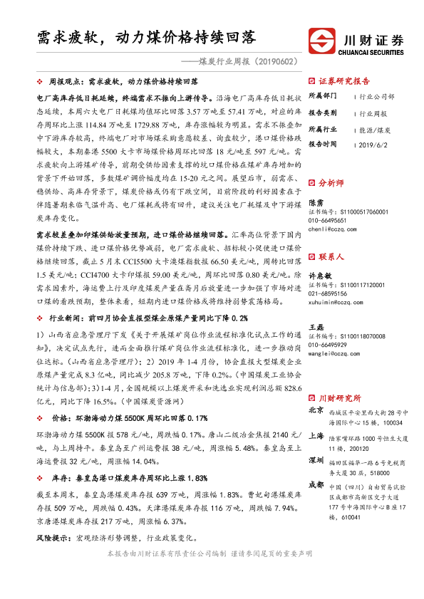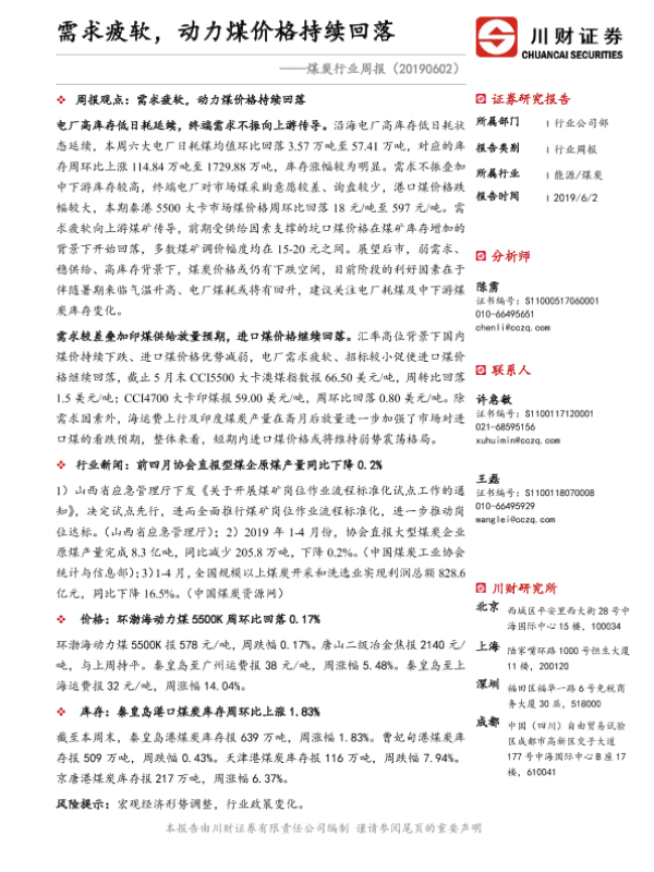 【川财证券】【20190602】20190602-川财证券-煤炭行业周报:需求疲软,动力煤价格持续回落-14页