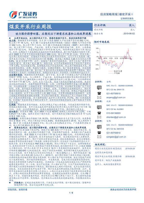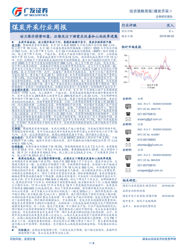 【广发证券】【20190602】20190602-广发证券-煤炭开采行业周报:动力煤价弱势回落,后期关注下游需求改善和山西改革进展-9页
