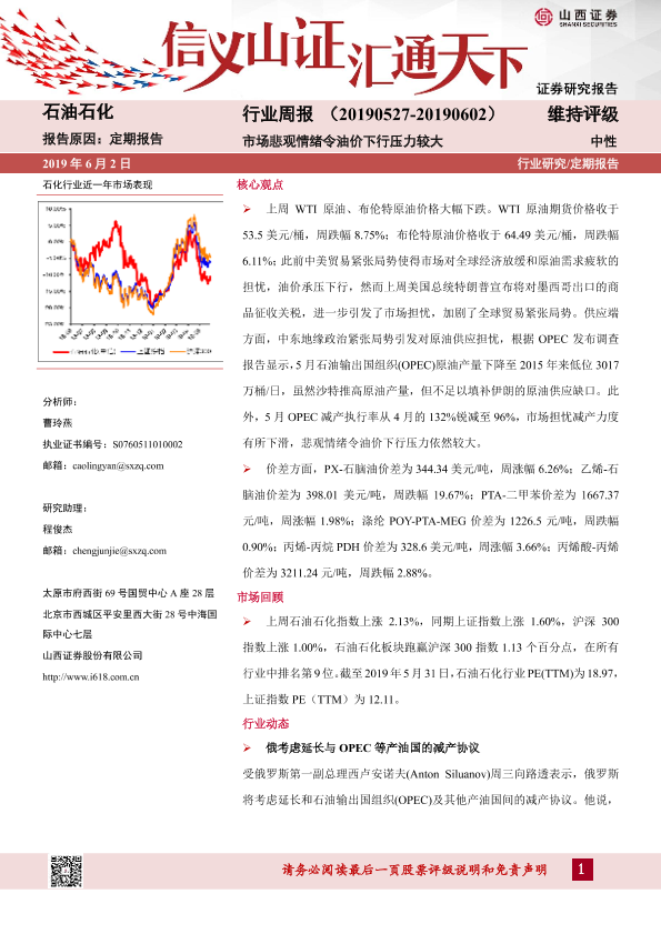 【山西证券】【20190602】20190602-山西证券-石油化工行业周报:市场悲观情绪令油价下行压力较大-13页