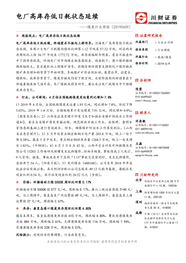 【川财证券】【20190609】20190609-川财证券-煤炭行业周报:电厂高库存低日耗状态延续-14页