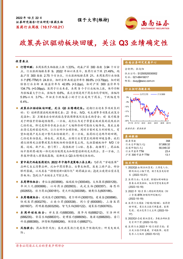 【西南证券】【20221022】医药行业周报:政策共识驱动板块回暖,关注Q3业绩确定性-38页