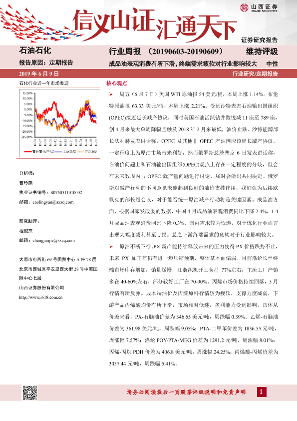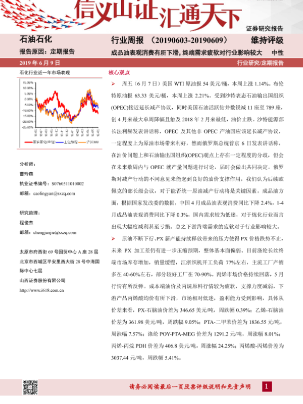 【山西证券】【20190609】20190609-山西证券-石油化工行业周报:成品油表观消费有所下滑,终端需求疲软对行业影响较大-13页