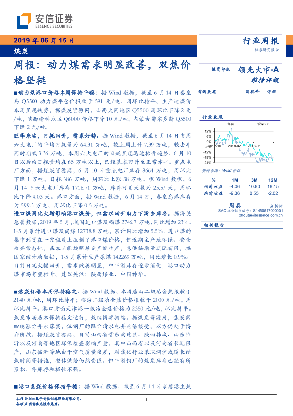 【安信证券】【20190615】20190615-安信证券-煤炭周报:动力煤需求明显改善,双焦价格坚挺-24页