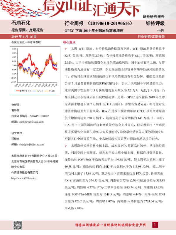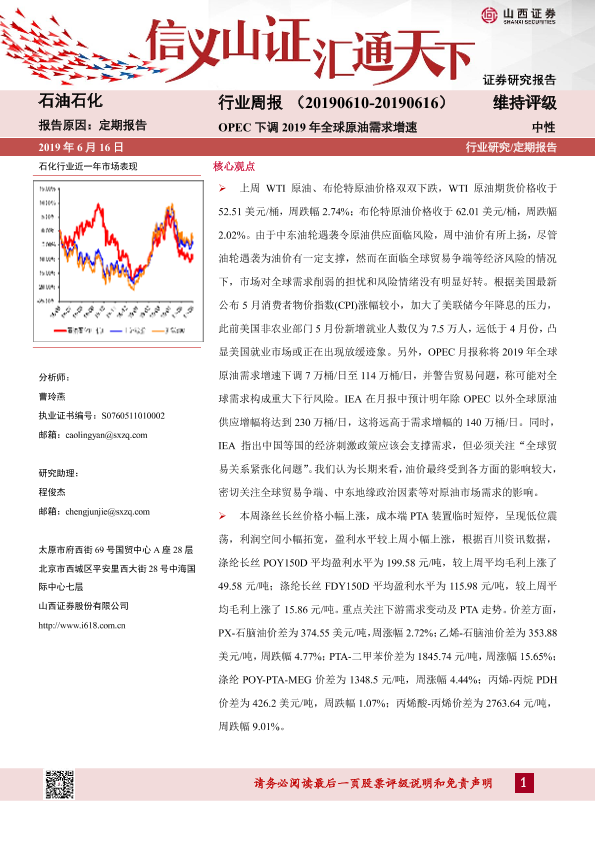 【山西证券】【20190616】石油石化行业周报:OPEC下调2019年全球原油需求增速-13页