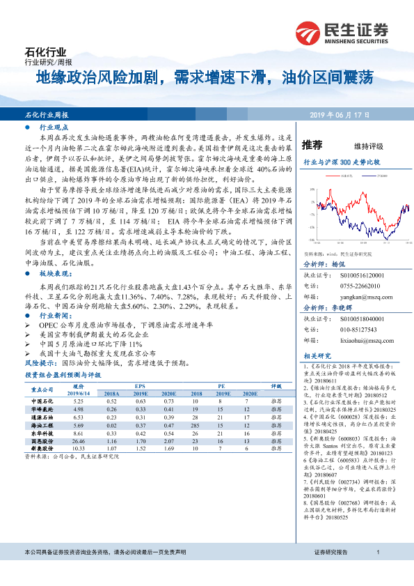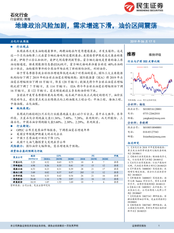 【民生证券】【20190617】20190617-民生证券-石化行业周报:地缘政治风险加剧,需求增速下滑,油价区间震荡-16页