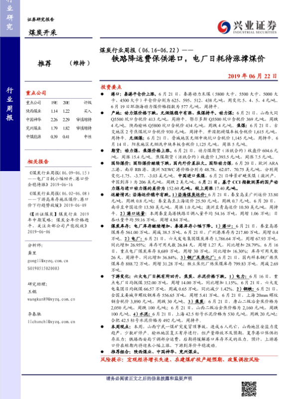 【兴业证券】【20190622】煤炭行业周报(06.16-06.22)——铁路降运费保供港口,电厂日耗待涨撑煤价-20页