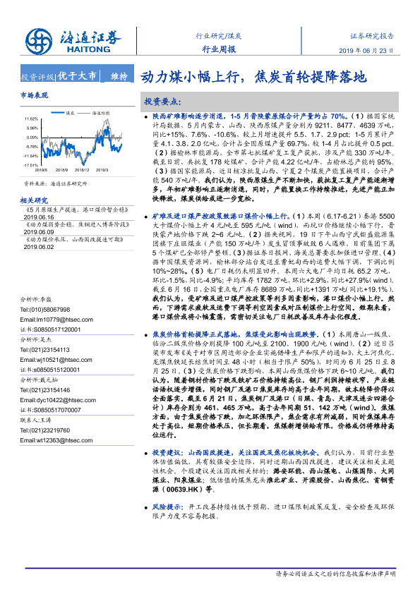 【海通证券】【20190623】煤炭行业周报:动力煤小幅上行,焦炭首轮提降落地-2页