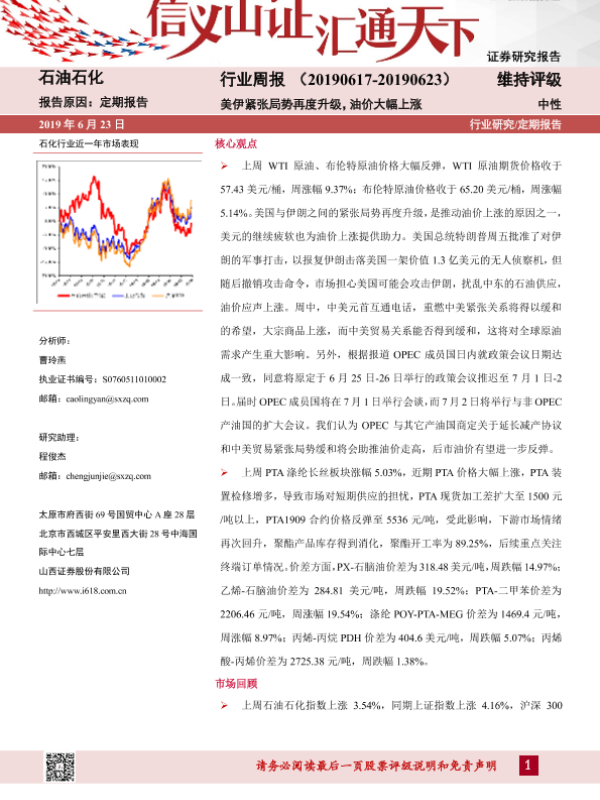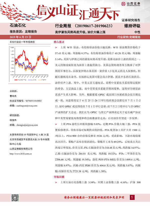 【山西证券】【20190623】石油石化行业周报:美伊紧张局势再度升级,油价大幅上涨-14页