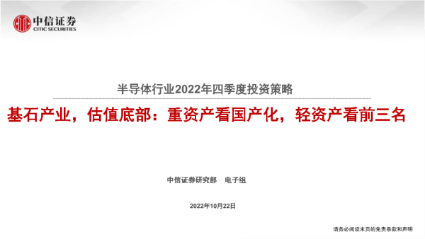 【中信证券】【20221022】半导体行业2022年四季度投资策略:基石产业,估值底部,重资产看国产化,轻资产看前三名-32页