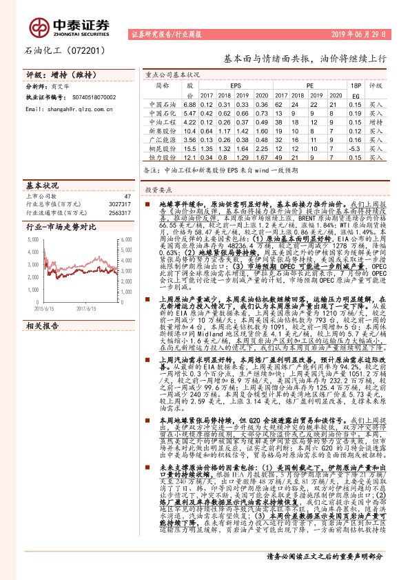 【中泰证券】【20190629】石油化工行业周报:基本面与情绪面共振,油价将继续上行-18页