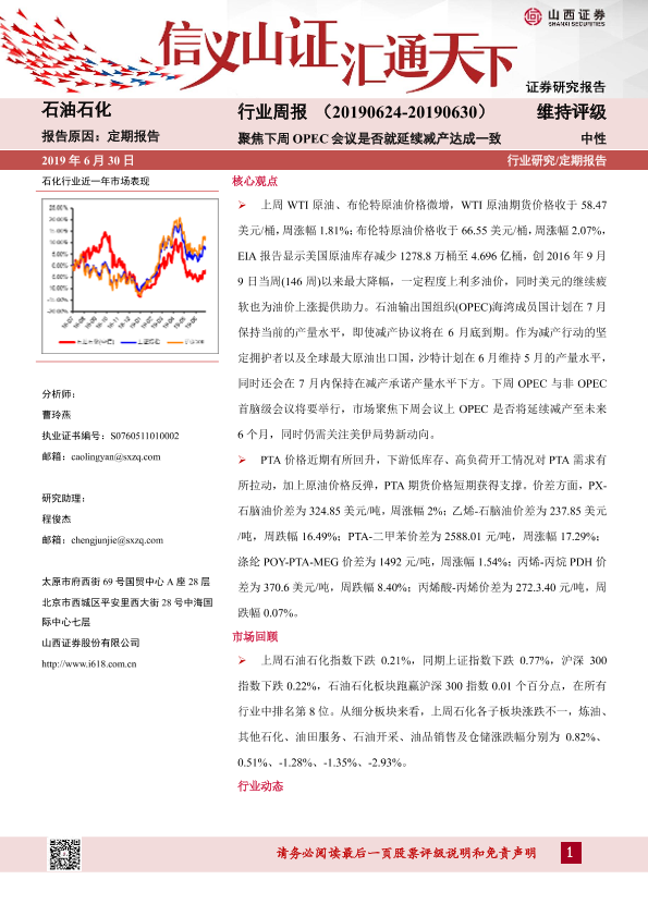 【山西证券】【20190630】石油石化行业周报:聚焦下周OPEC会议是否就延续减产达成一致-13页
