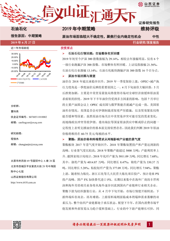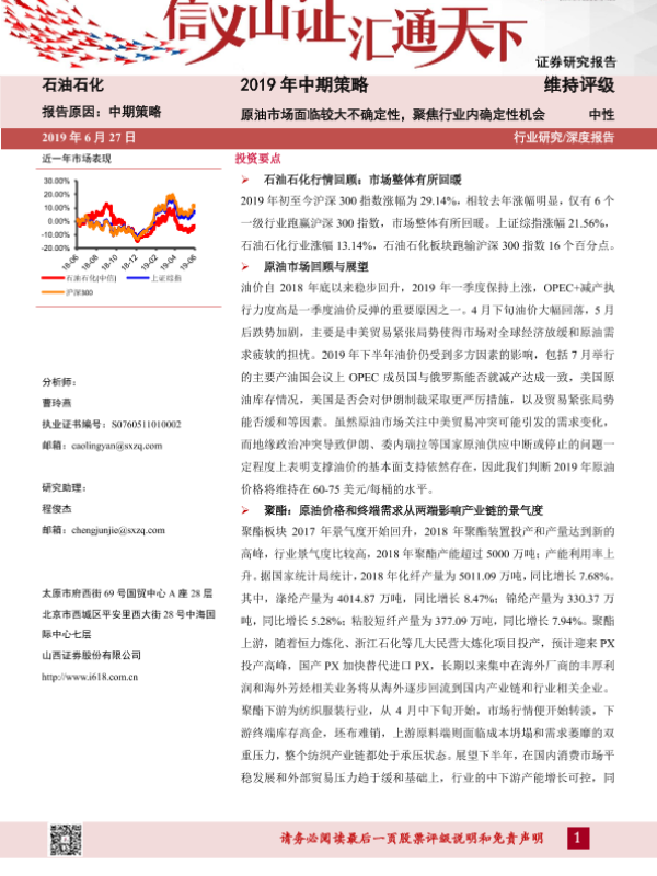 【山西证券】【20190627】石油石化2019年中期策略:原油市场面临较大不确定性,聚焦行业内确定性机会-37页