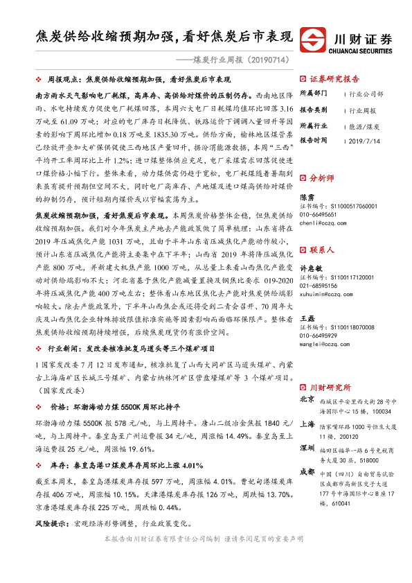 【川财证券】【20190714】20190714-川财证券-煤炭行业周报:焦炭供给收缩预期加强,看好焦炭后市表现-14页
