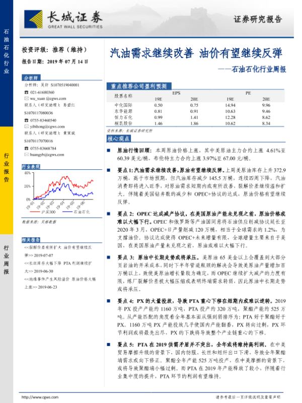 【长城证券】【20190714】20190714-长城证券-石油石化行业周报:汽油需求继续改善 油价有望继续反弹-10页