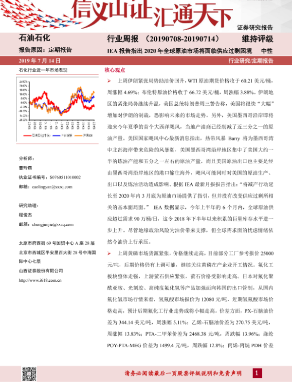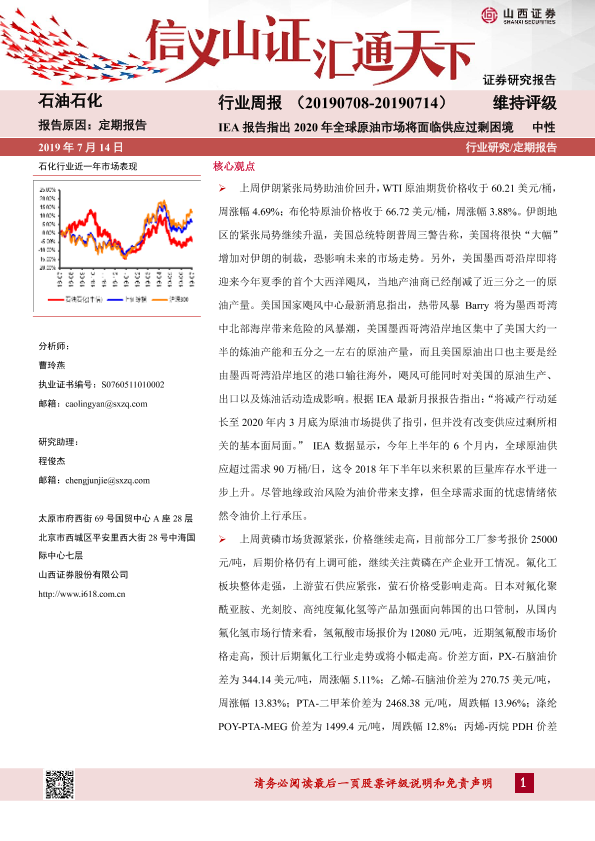 【山西证券】【20190714】石油石化行业周报:IEA报告指出2020年全球原油市场将面临供应过剩困境-13页