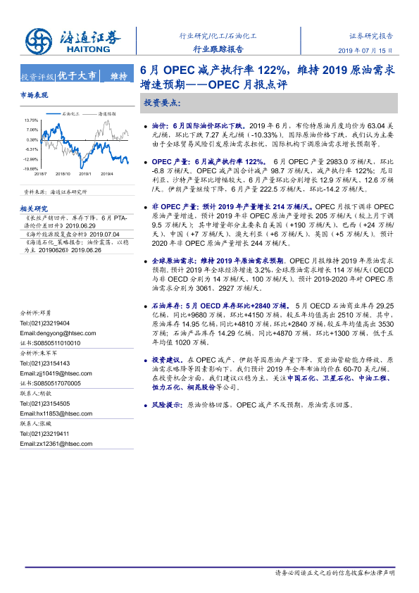 【海通证券】【20190715】20190715-海通证券-石油化工行业跟踪报告:OPEC月报点评:6月OPEC减产执行率122%,维持2019原油需求增速预期-5页