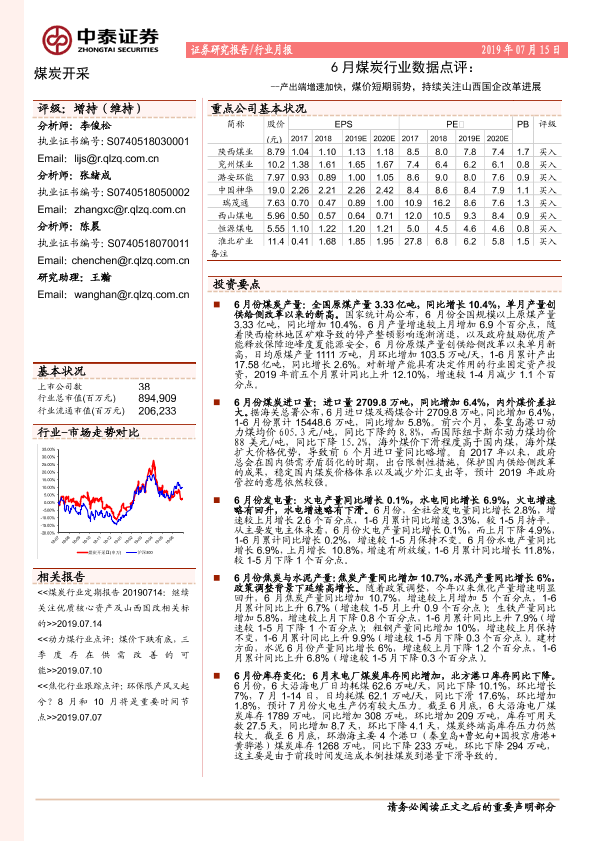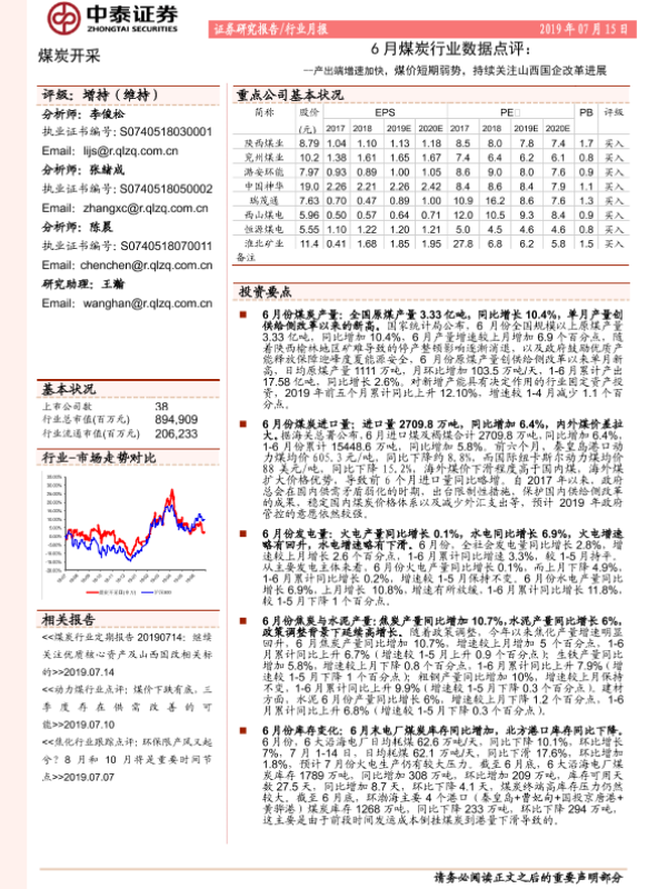 【中泰证券】【20190715】6月煤炭行业数据点评:产出端增速有所加快,煤价短期弱势,持续关注山西国企改革进展-6页