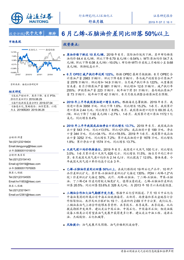 【海通证券】【20190716】20190716-海通证券-石油化工行业月报:6月乙烯-石脑油价差同比回落50%以上-8页