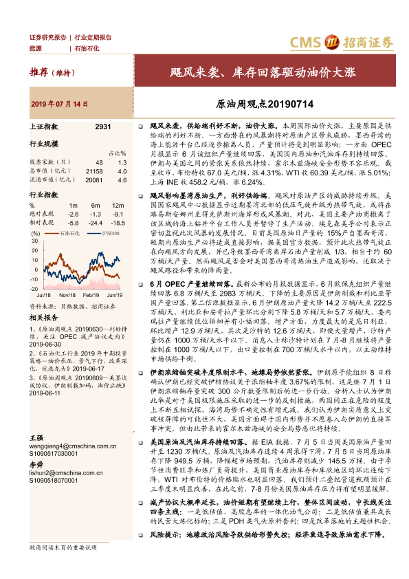 【海通证券】【20190714】原油周观点:飓风来袭、库存回落驱动油价大涨-15页