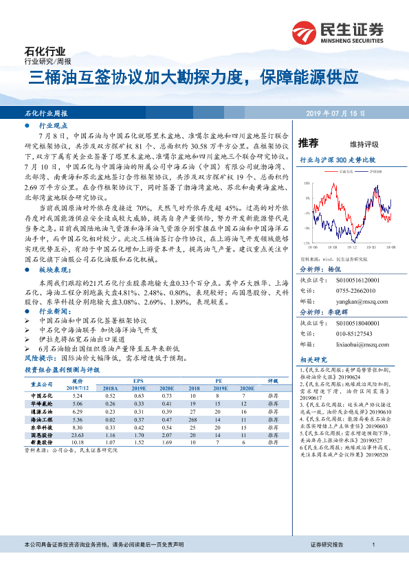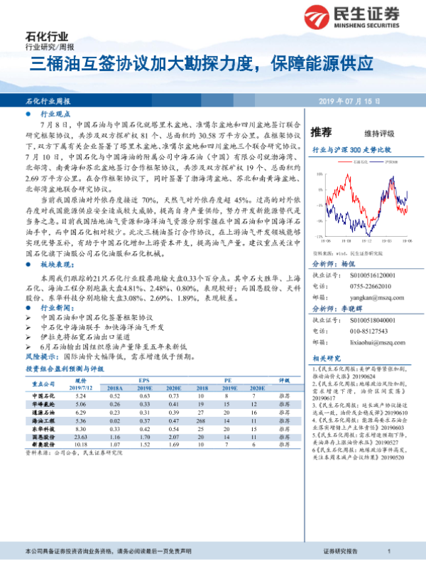 【民生证券】【20190715】20190715-民生证券-石化行业周报:三桶油互签协议加大勘探力度,保障能源供应-15页