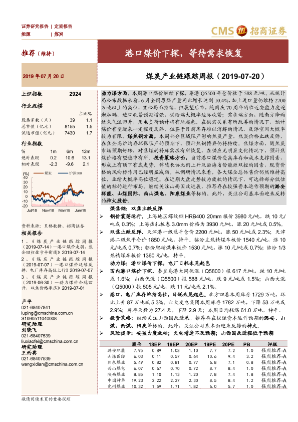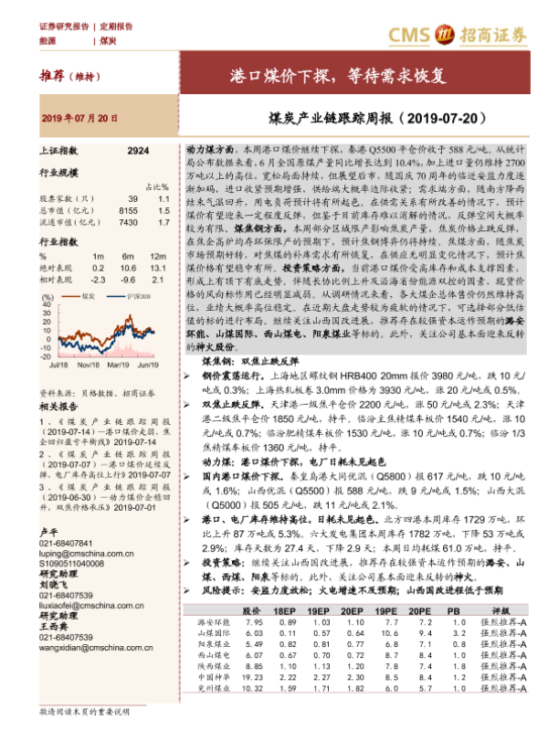 【海通证券】【20190720】煤炭产业链跟踪周报:港口煤价下探,等待需求恢复-21页