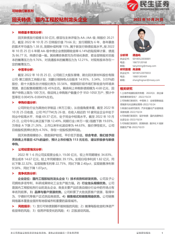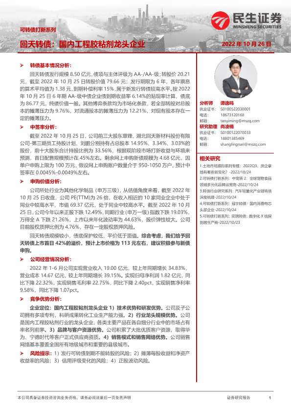 【民生证券】【20221026】可转债打新系列:回天转债,国内工程胶粘剂龙头企业-15页