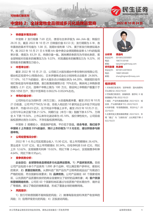 【民生证券】【20221024】可转债打新系列:中宠转2,全球宠物食品领域多元化品牌运营商-15页