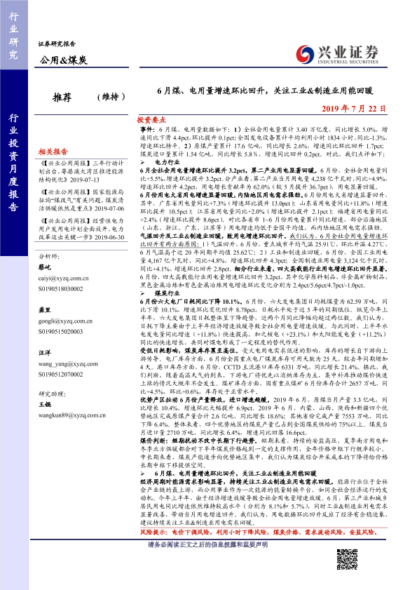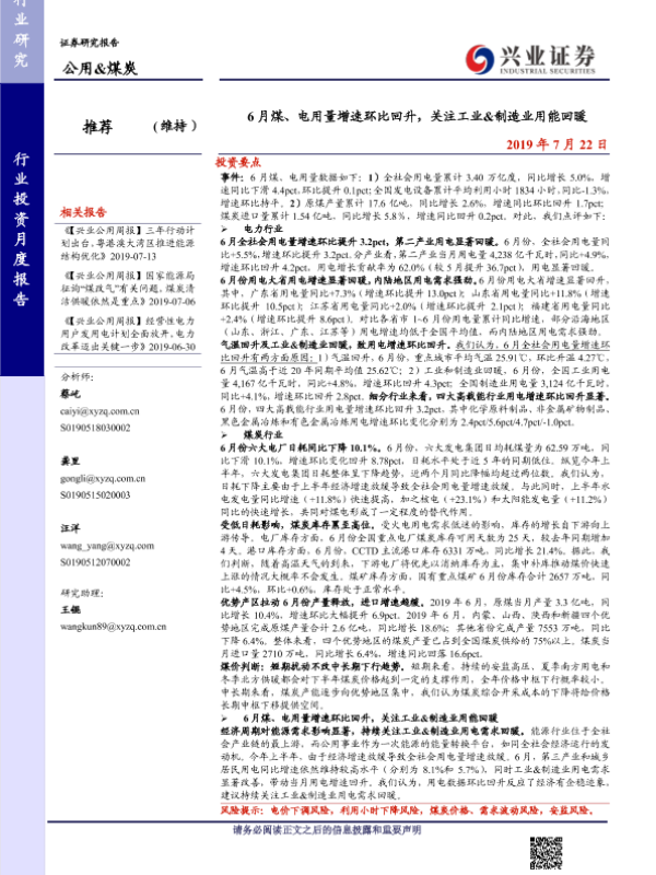 【兴业证券】【20190722】20190722-兴业证券-公用&煤炭行业投资月度报告:6月煤、电用量增速环比回升,关注工业&制造业用能回暖-23页