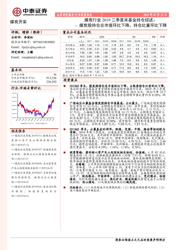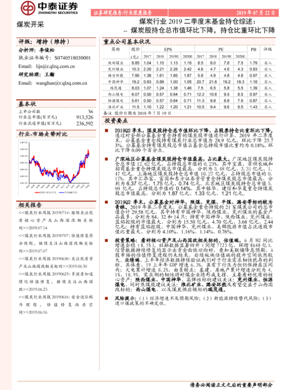 【中泰证券】【20190722】煤炭行业2019二季度末基金持仓综述:煤炭股持仓总市值环比下降,持仓比重环比下降-9页