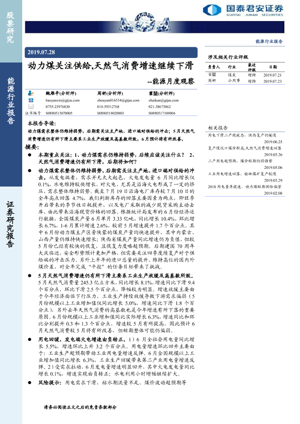 【国泰君安证券】【20190728】20190728-国泰君安-能源月度观察:动力煤关注供给,天然气消费增速继续下滑-19页