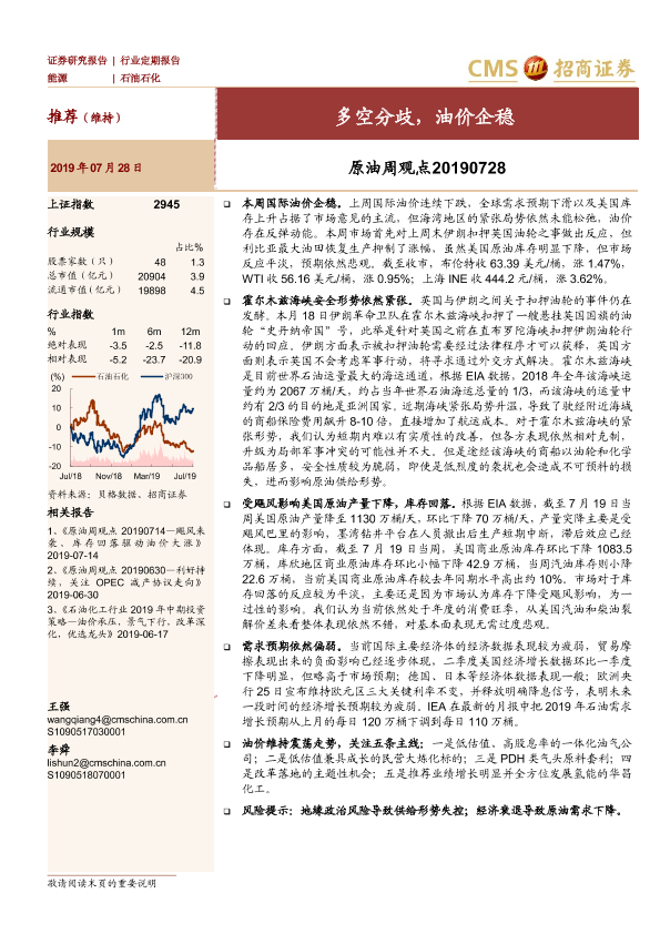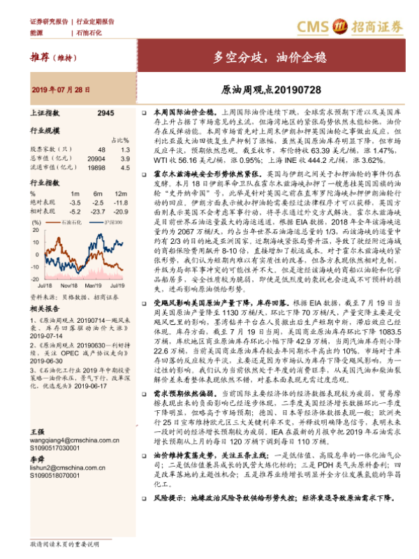 【海通证券】【20190728】原油周观点:多空分歧,油价企稳-15页