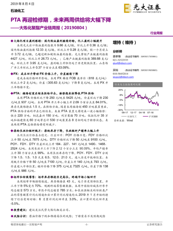 【光大证券】【20190804】20190804-光大证券-大炼化聚酯产业链周报:PTA再迎检修期,未来两周供给将大幅下降-13页