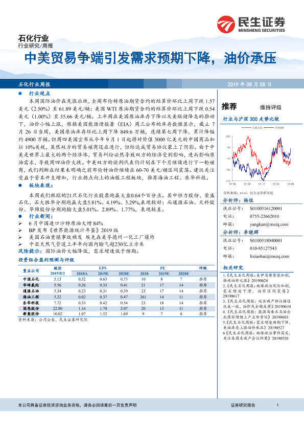 【民生证券】【20190805】20190805-民生证券-石油石化行业周报:中美贸易争端引发需求预期下降了,油价承压-16页