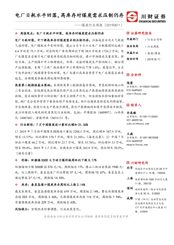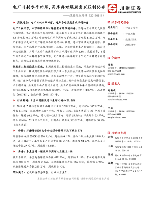 【川财证券】【20190811】20190811-川财证券-煤炭行业周报:电厂日耗水平回落,高库存对煤炭需求压制仍存-14页