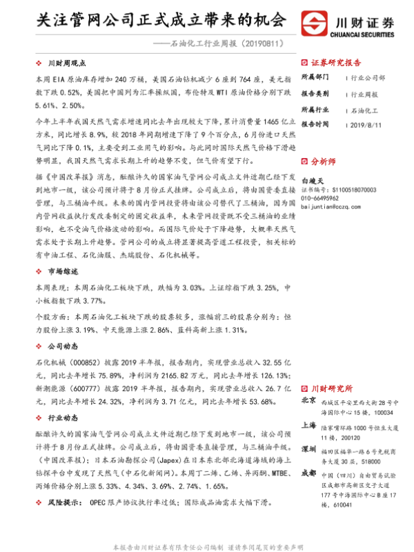 【川财证券】【20190811】20190811-川财证券-石油化工行业周报:关注管网公司正式成立带来的机会-12页