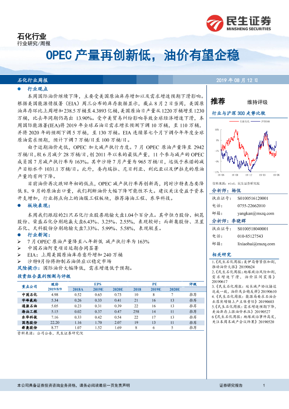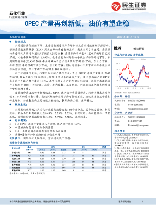 【民生证券】【20190812】20190812-民生证券-石化行业:OPEC产量再创新低,油价有望企稳-15页