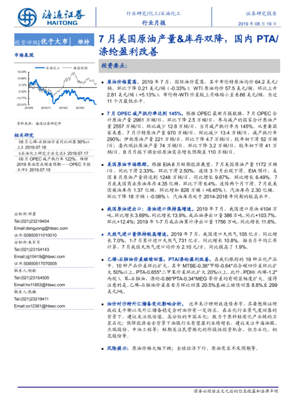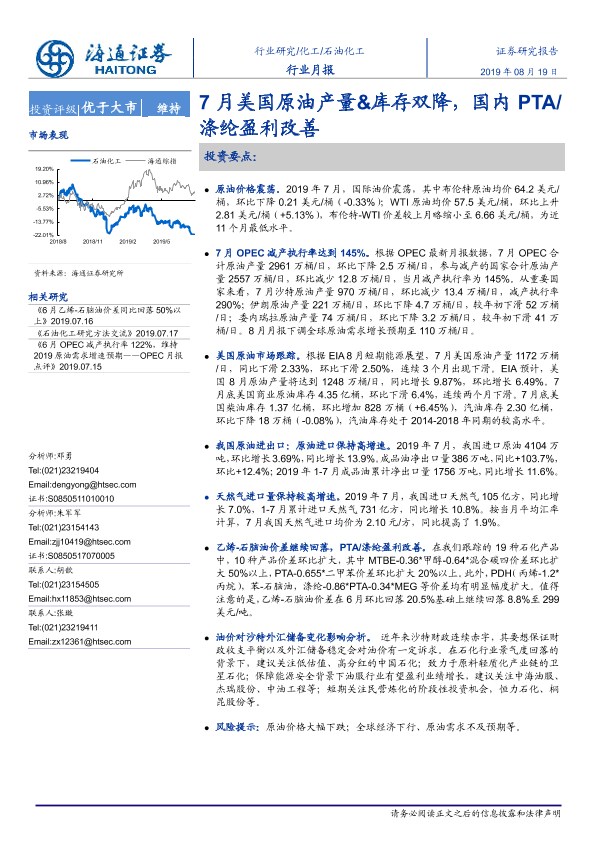 【海通证券】【20190819】20190819-海通证券-石油化工行业月报:7月美国原油产量&库存双降,国内PTA 涤纶盈利改善-10页