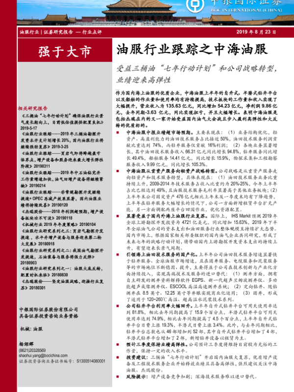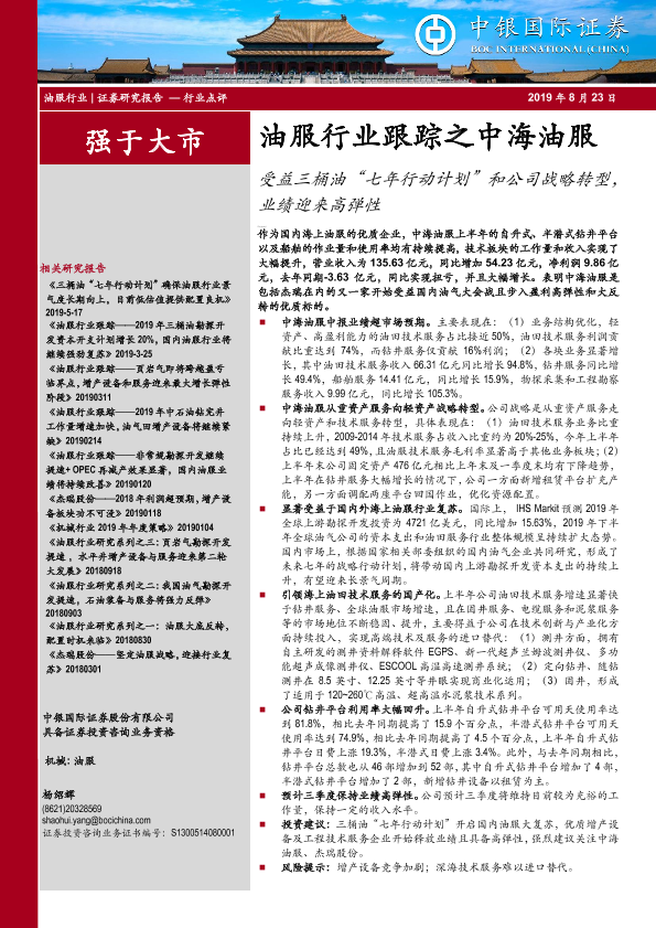 【中银证券】【20190823】油服行业跟踪之中海油服:受益三桶油“七年行动计划”和公司战略转型,业绩迎来高弹性-7页