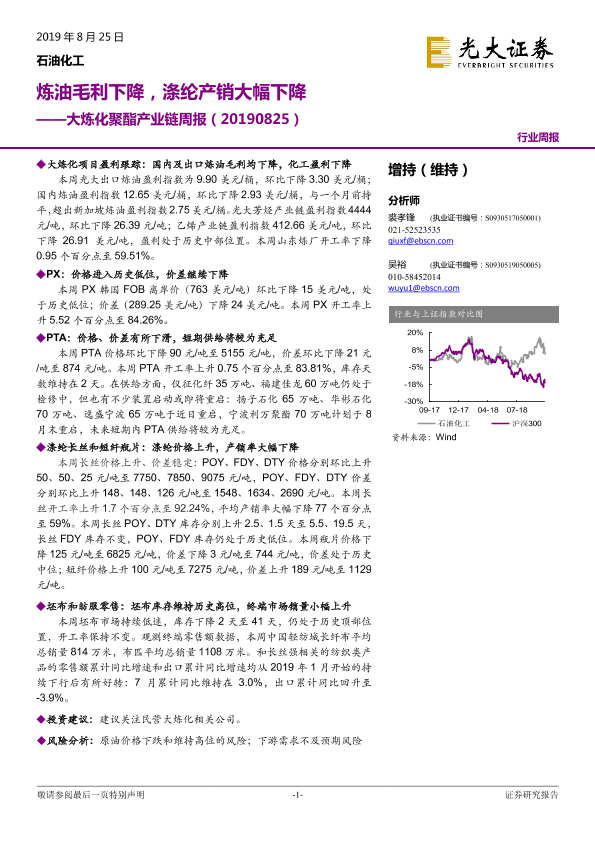 【光大证券】【20190825】大炼化聚酯产业链周报-炼油毛利下降,涤纶产销大幅下降-13页