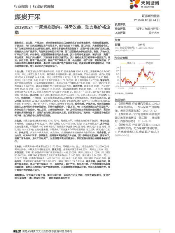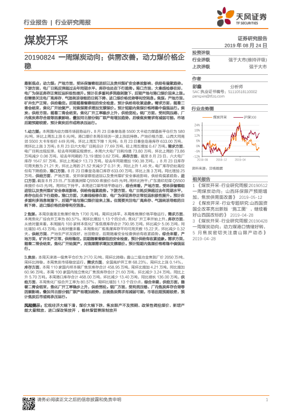 【天风证券】【20190824】20190824-天风证券-煤炭开采行业一周煤炭动向:供需改善,动力煤价格企稳-19页