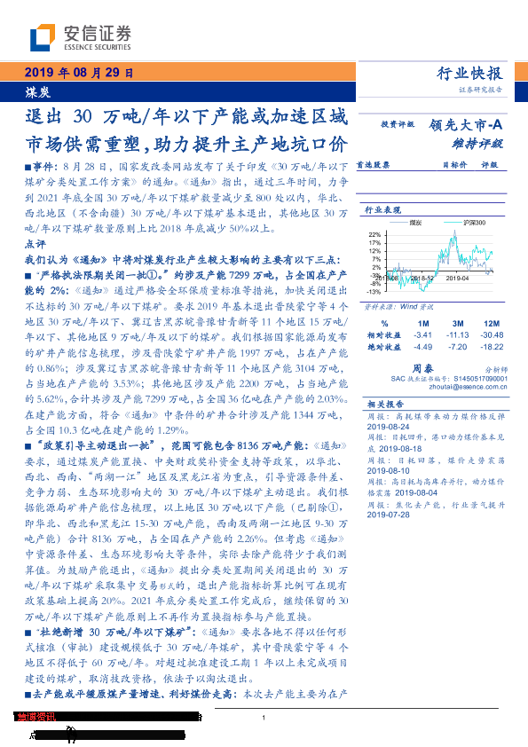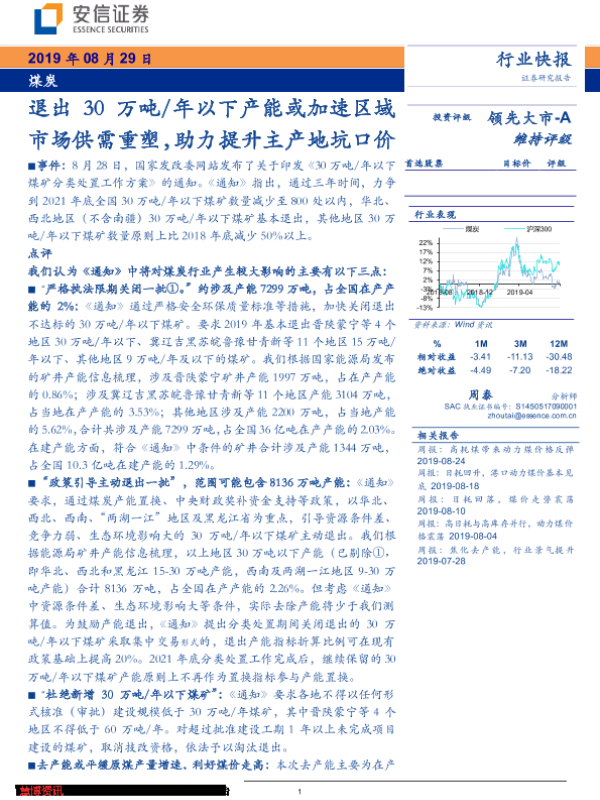 【安信证券】【20190829】20190829-安信证券-煤炭行业快报:退出30万吨 年以下产能或加速区域市场供需重塑,助力提升主产地坑口价-6页