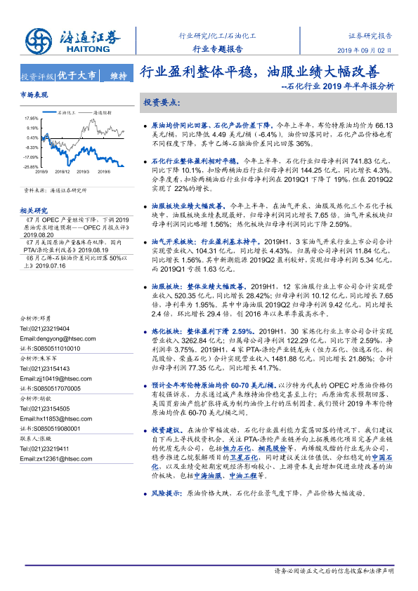 【海通证券】【20190902】石化行业2019年半年报分析:行业盈利整体平稳,油服业绩大幅改善-21页