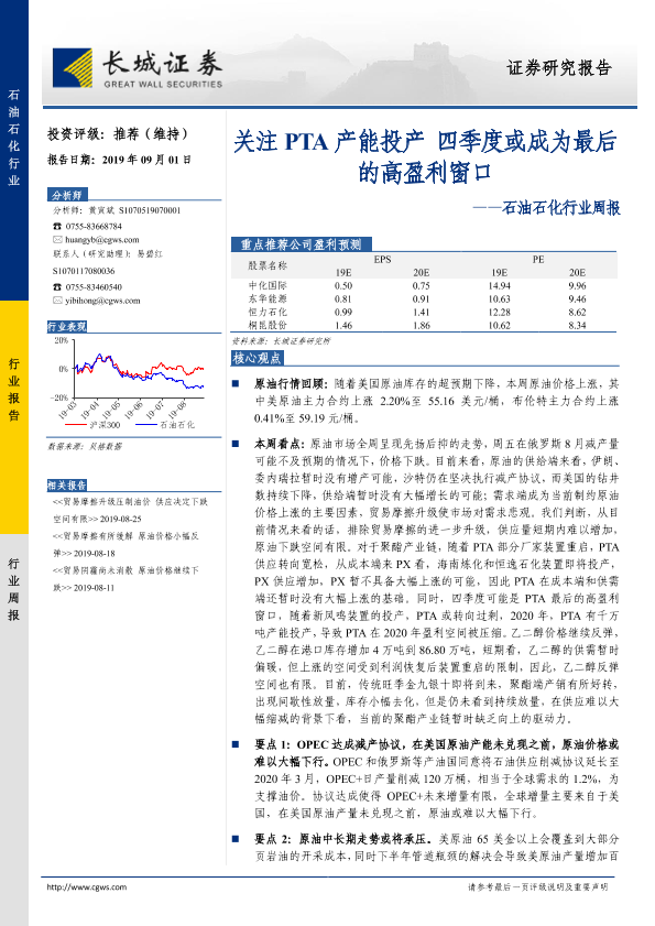 【长城证券】【20190901】石油石化行业周报:关注PTA产能投产 四季度或成为最后的高盈利窗口-12页
