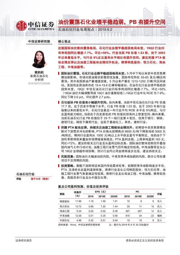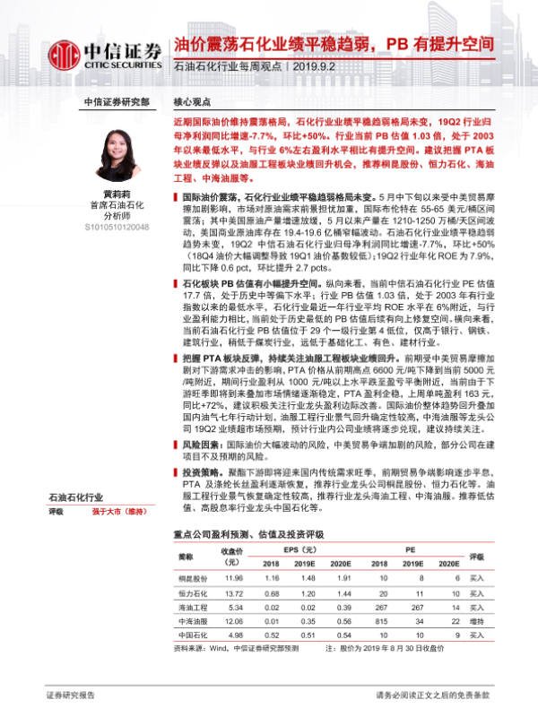 【中信证券】【20190902】20190902-中信证券-石油石化行业每周观点:油价震荡石化业绩平稳趋弱,PB有提升空间-16页