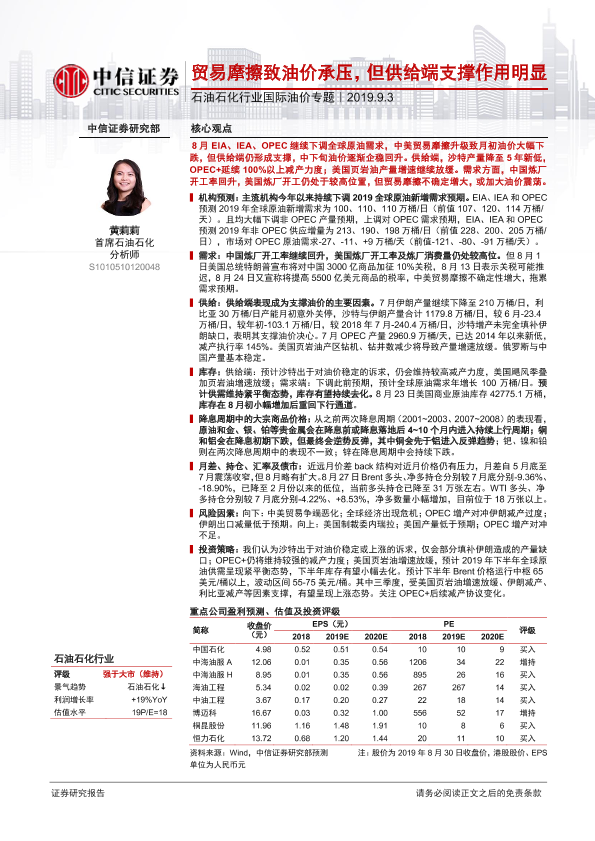 【中信证券】【20190903】石油石化行业国际油价专题:贸易摩擦致油价承压,但供给端支撑作用明显-22页