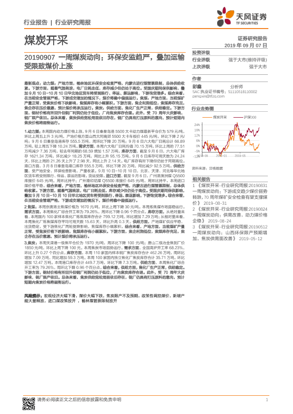 【天风证券】【20190907】20190907-天风证券-煤炭开采:一周煤炭动向:环保安监趋严,叠加运输受限致煤价上涨-19页