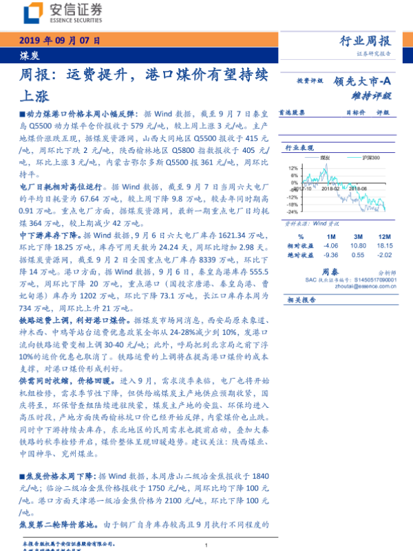 【安信证券】【20190907】20190907-安信证券-煤炭周报:运费提升,港口煤价有望持续上涨-24页