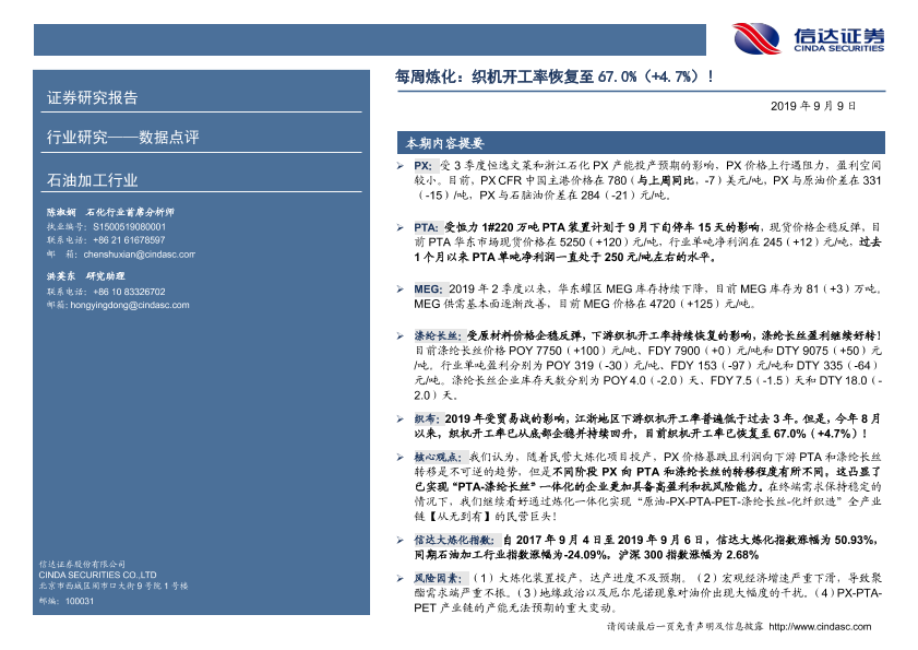 【信达证券】【20190909】每周炼化:织机开工率恢复至67.0%(+4.7%)!-7页