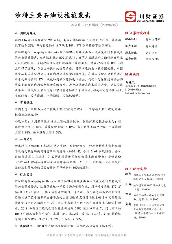 【川财证券】【20190915】20190915-川财证券-石油化工行业周报:沙特主要石油设施被袭击-12页
