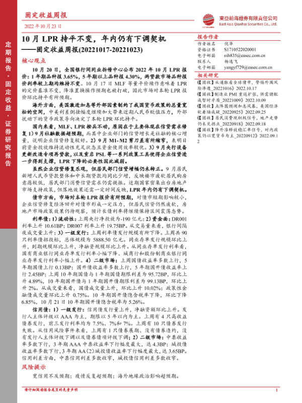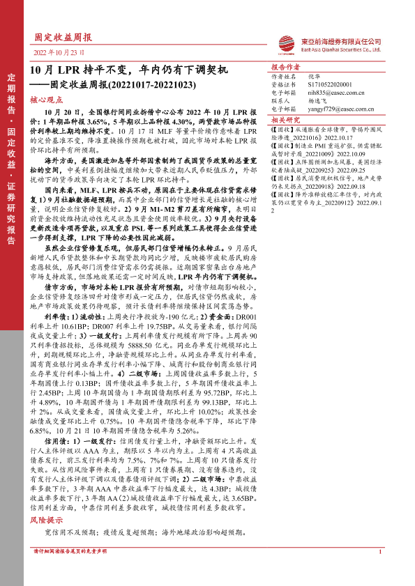 【东亚前海证券】【20221023】固定收益周报:10月LPR持平不变,年内仍有下调契机-24页